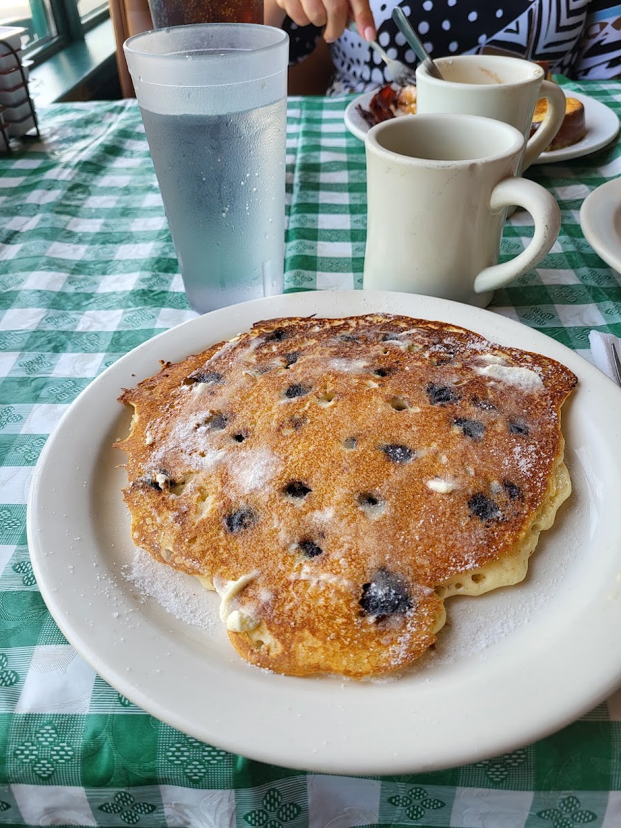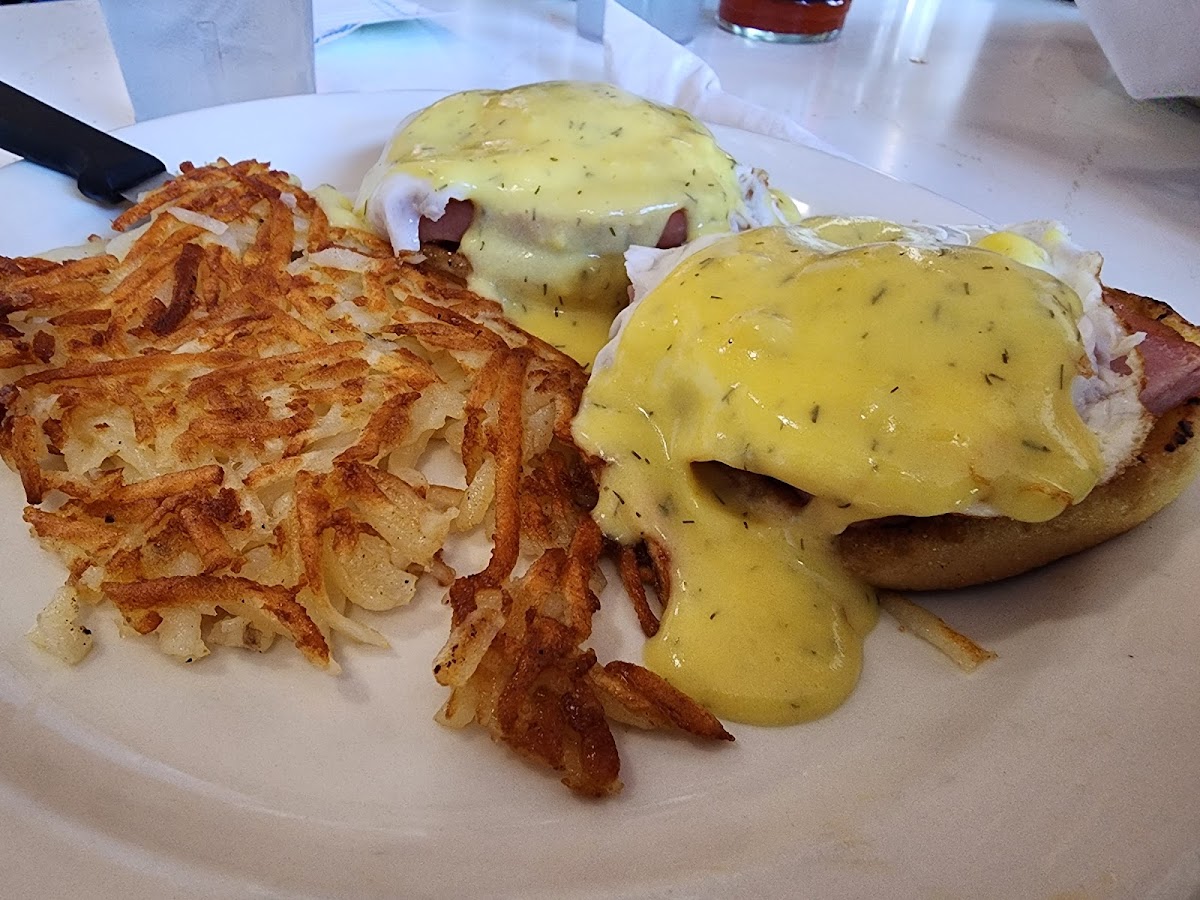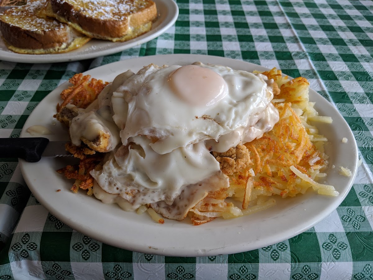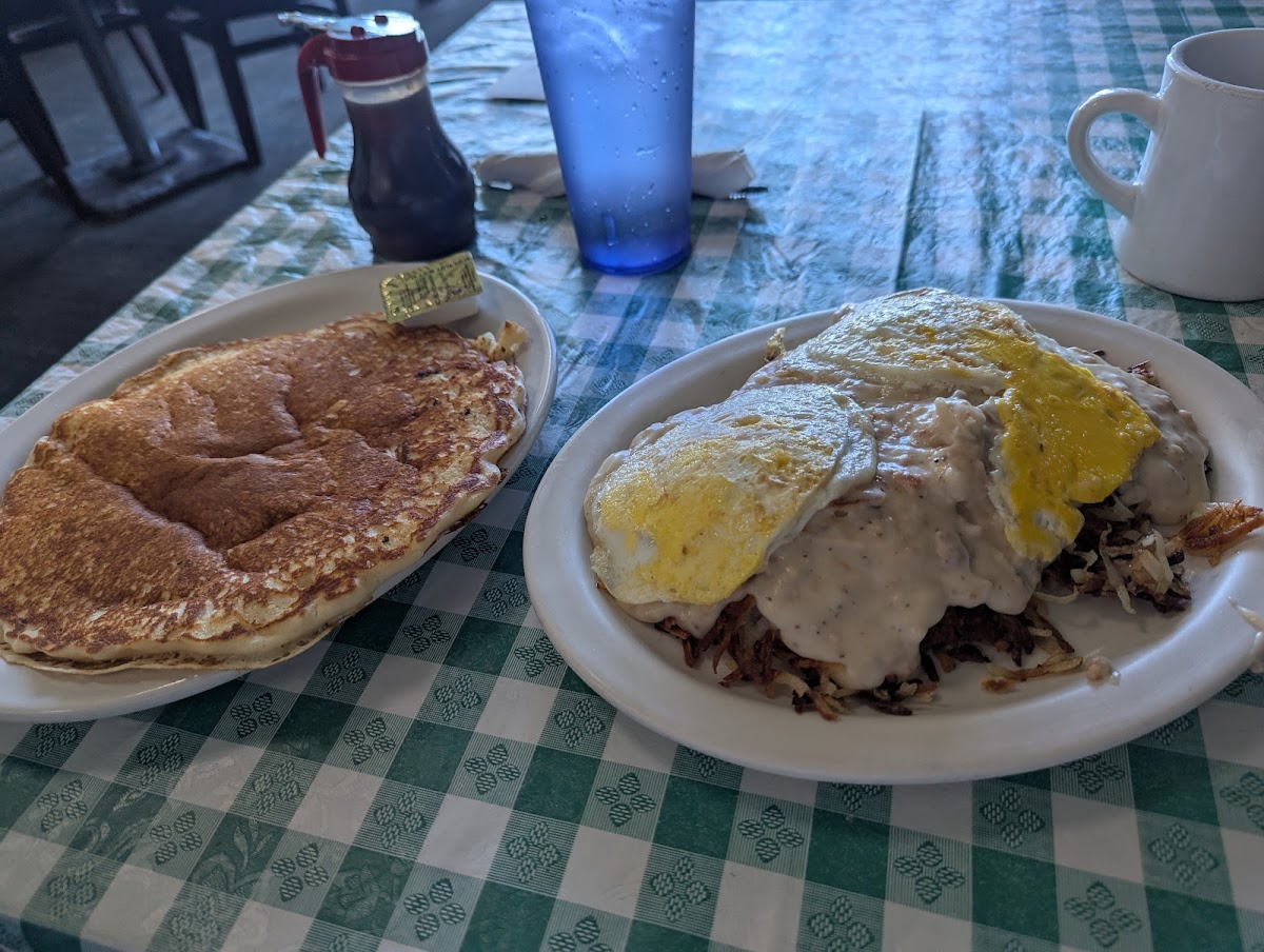 The menu highlights include a range of breakfast staples—eggs Benedict, blueberry pancakes, and a variety of skillets—that emphasize generous portions designed to satisfy robust appetites. For lunch, simpler, filling options like BLT and club sandwiches or smothered hamburger steaks maintain the comfort-food theme. The presence of non-pork options like turkey sausage shows a thoughtful nod to different preferences or dietary needs, rounding out an otherwise classic lineup.