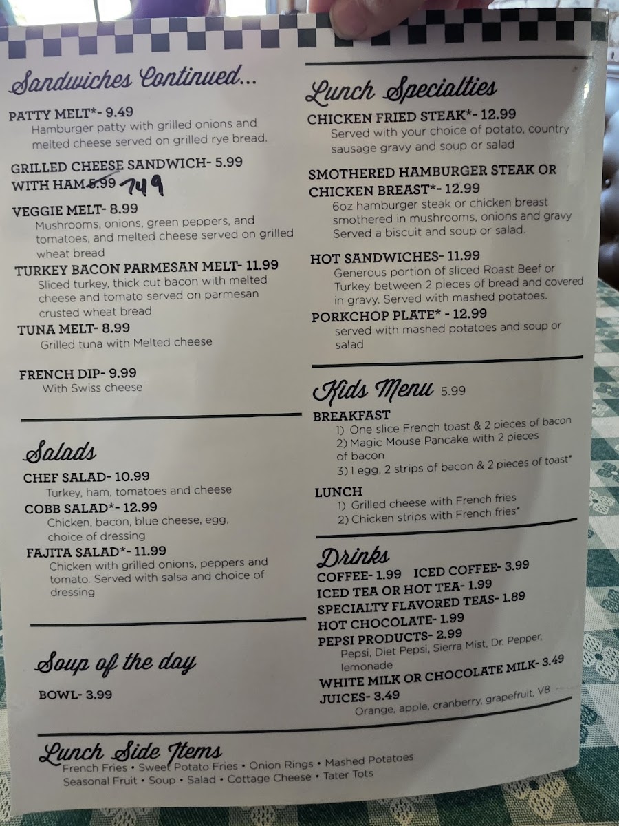 - Lunch Specials: Notable dishes include Chicken Fried Steak and Smothered Hamburger Steak, as well as various skillet and scramble options like the Chorizo Skillet and Kielbasa Scramble.